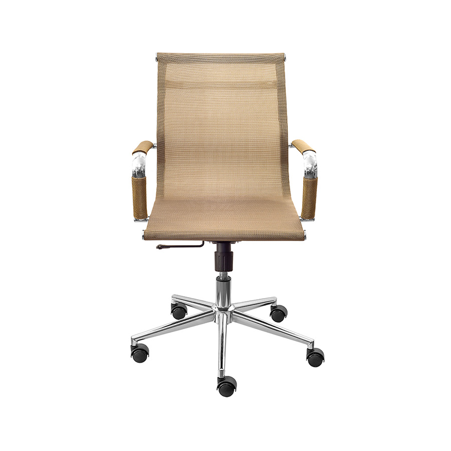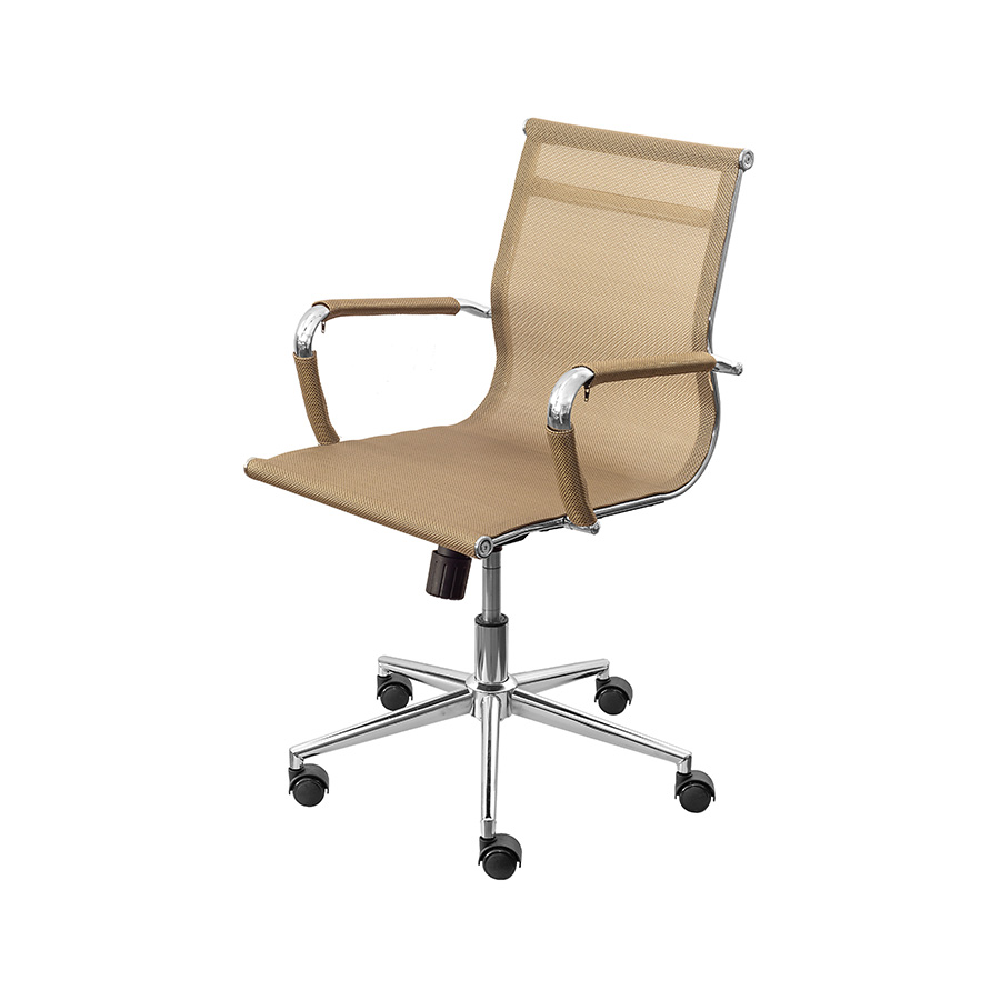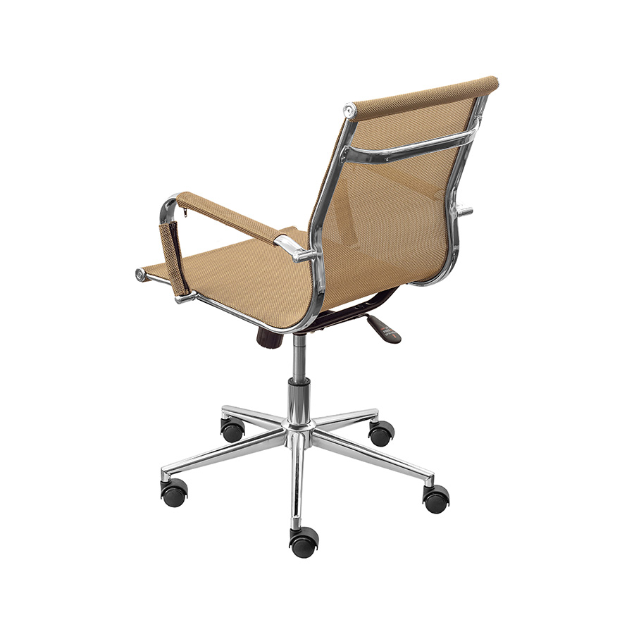Assento em tela com estrutura cromada. Sistema relax com travamento. Base de encaixe metalizado. Rodas em PU que não danificam o piso